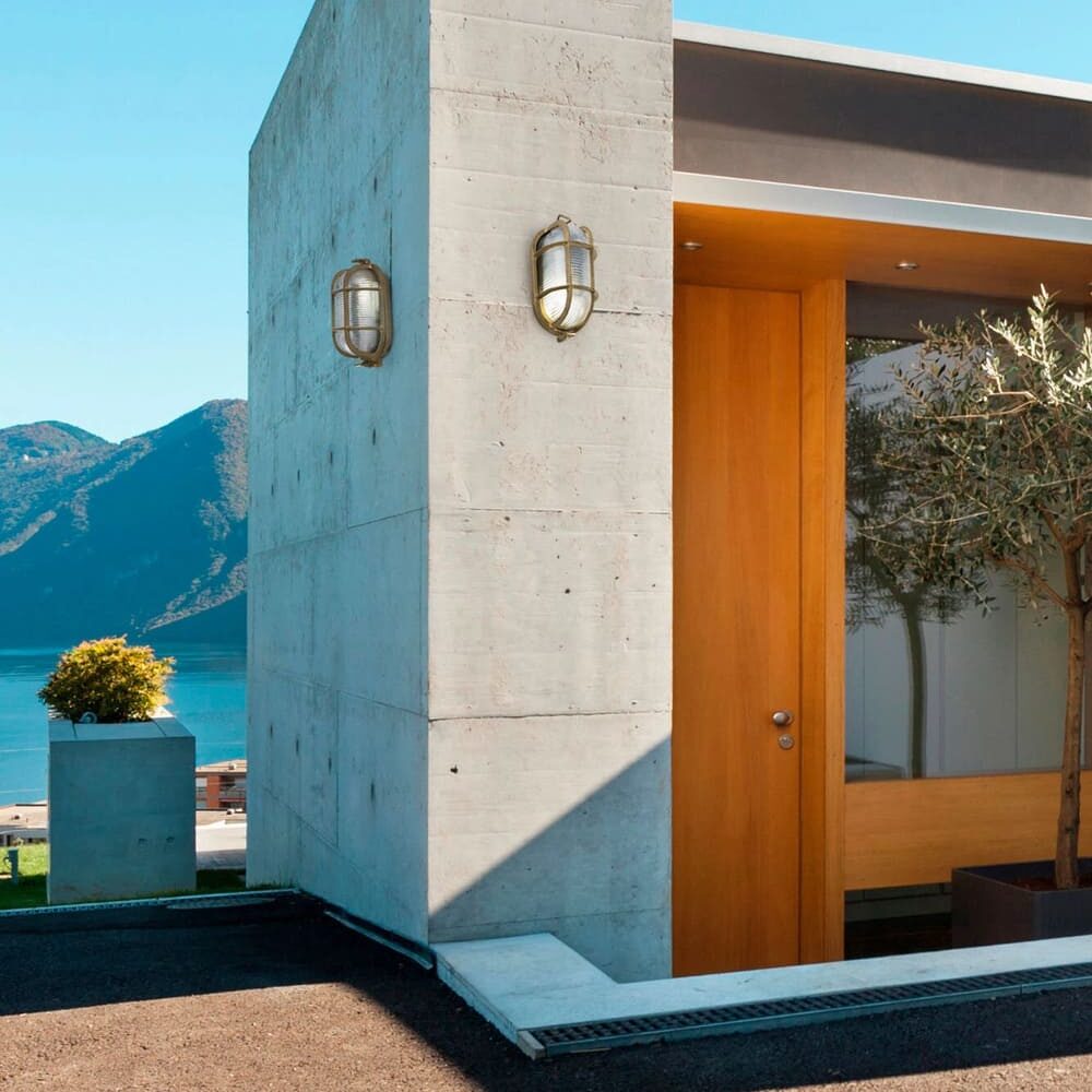 Applique murale de style industriel, adapté pour l’extérieur. Fabriquée en laiton et verre d’opale.