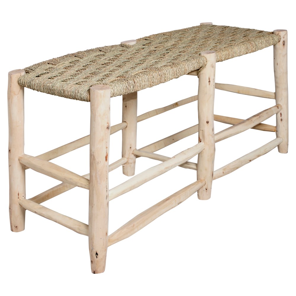 Banc de style ethnique fabriqué en bois de laurier. Assise tapissée en palmier tressé.