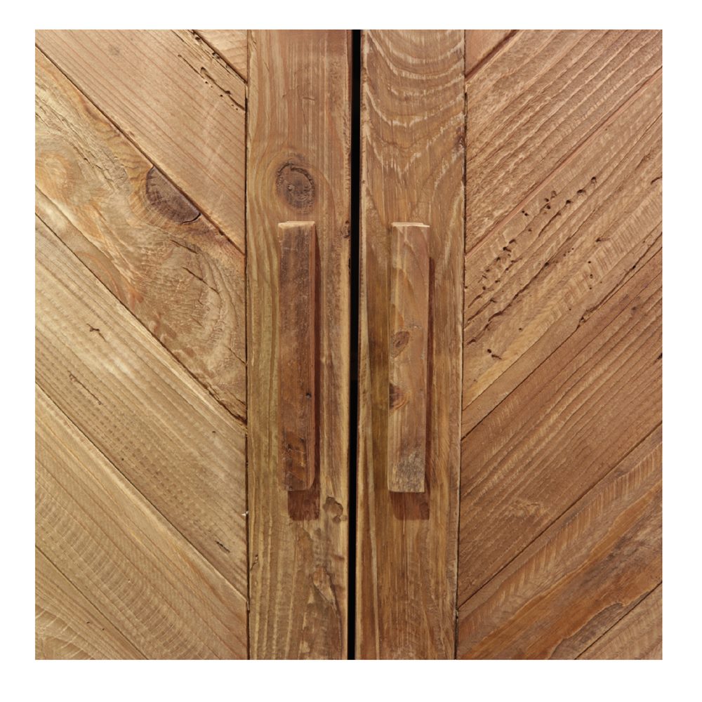 Buffet fabriqué en bois de pin recyclé, doté de deux portes battantes ornées d’un motif géométrique en chevrons.
