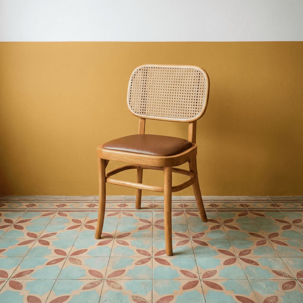 L’assise en similicuir offre une finition élégante et confortable, douce au toucher et résistante à l’usage quotidien. Ce matériau, facile d’entretien, ajoute une touche de sophistication sans nuire à l’authenticité de l’ensemble.