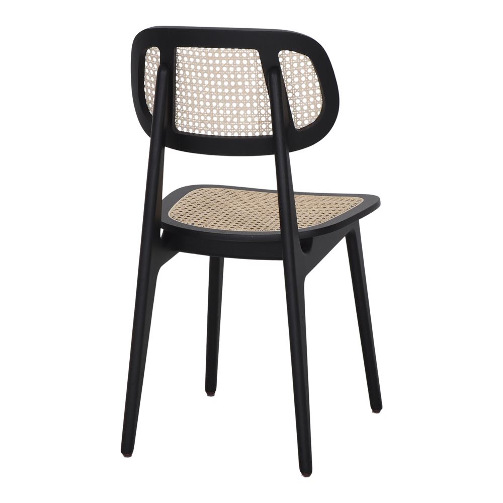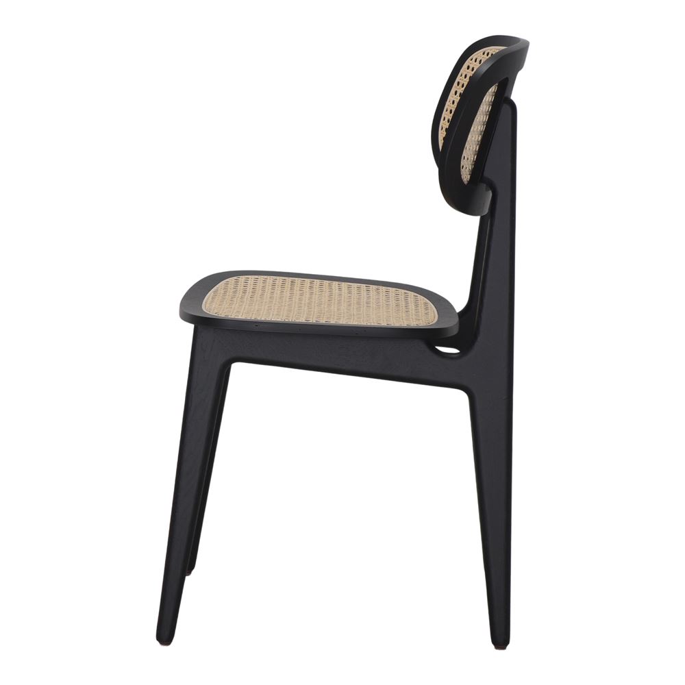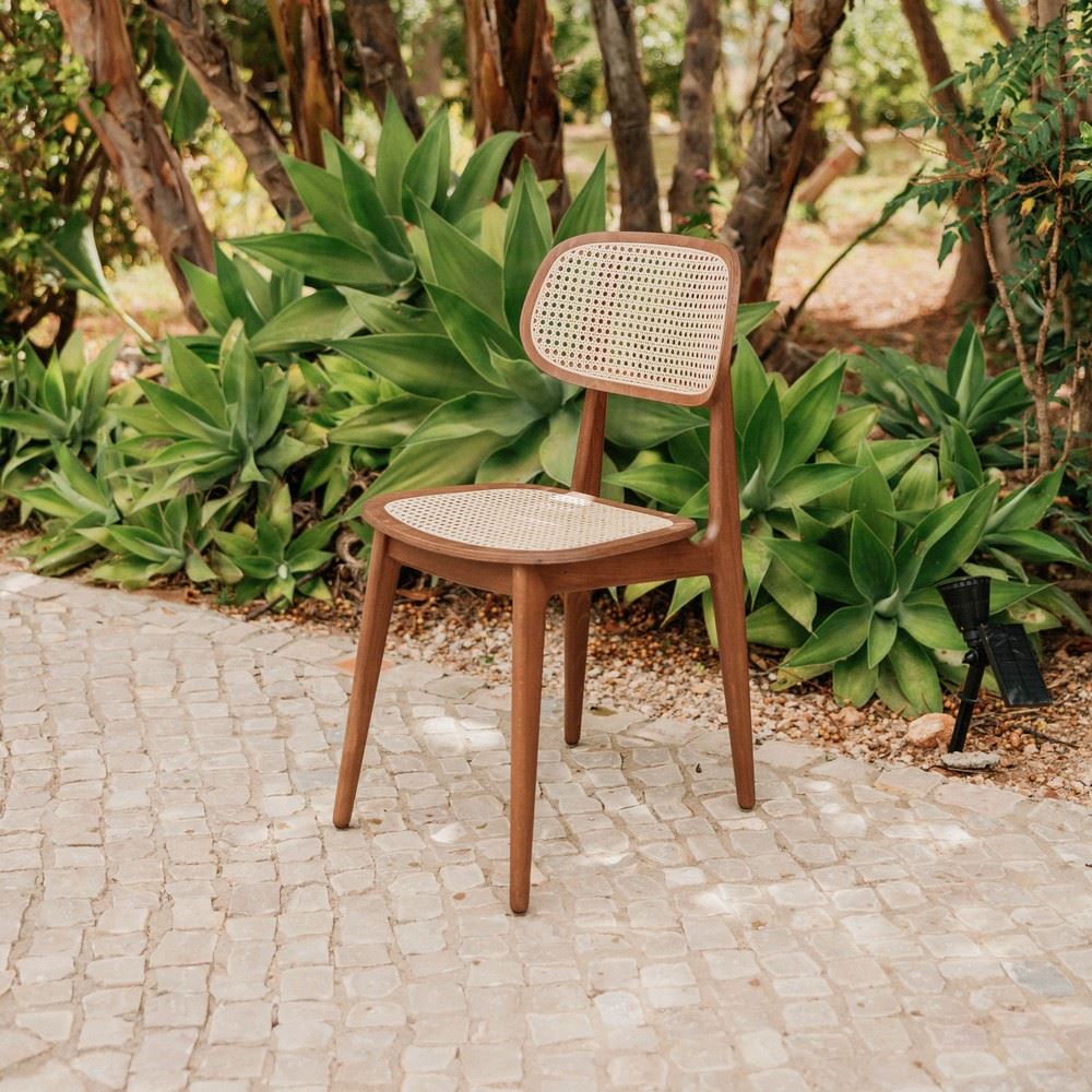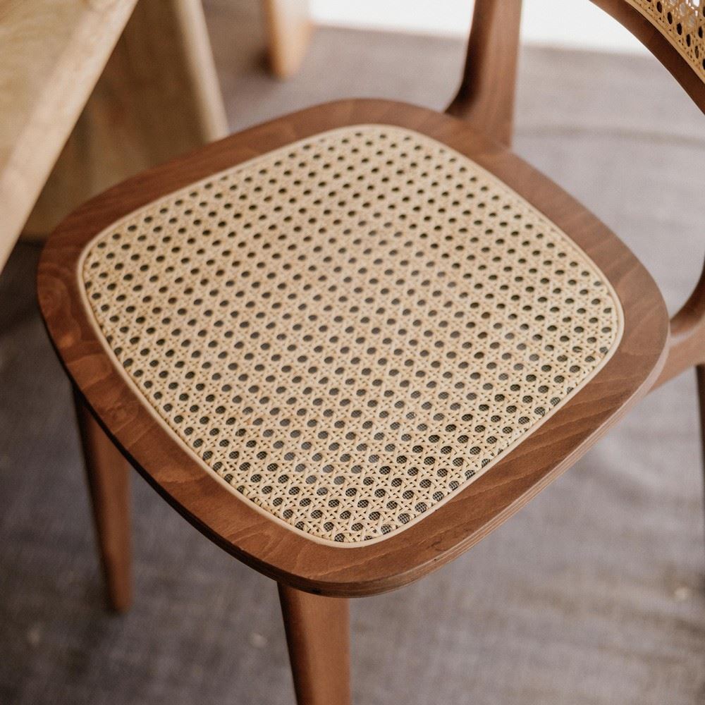 L’assise et le dossier sont réalisés en maille de fibres naturelles de type cannage, un matériau fabriqué à la main qui se distingue par sa légèreté et son esthétique intemporelle. Ce détail ajoute non seulement une touche de sophistication, mais assure également un confort grâce à sa flexibilité. La texture délicate du cannage contraste harmonieusement avec la solidité du bois, créant un équilibre visuel unique.