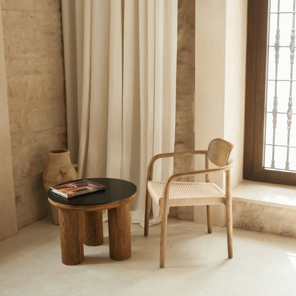 L’assise, réalisée en fibre naturelle tressée, ajoute une touche artisanale et organique qui renforce son caractère unique. Cette combinaison de matériaux assure non seulement tout le confort souhaité, mais offre également un contraste attrayant entre la texture chaleureuse du bois et le design tissé de l’assise.