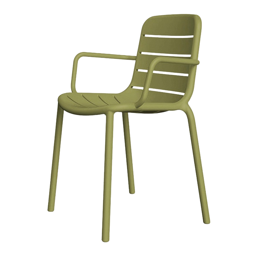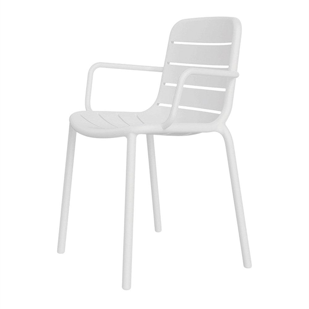 Chaise avec accoudoirs pour usage intérieur ou extérieur. Fibre de verre et polypropylène via technologie de moulage assistée par gaz. Traitement anti-UV.