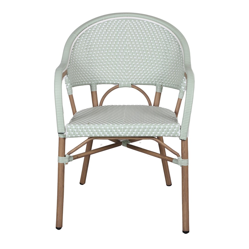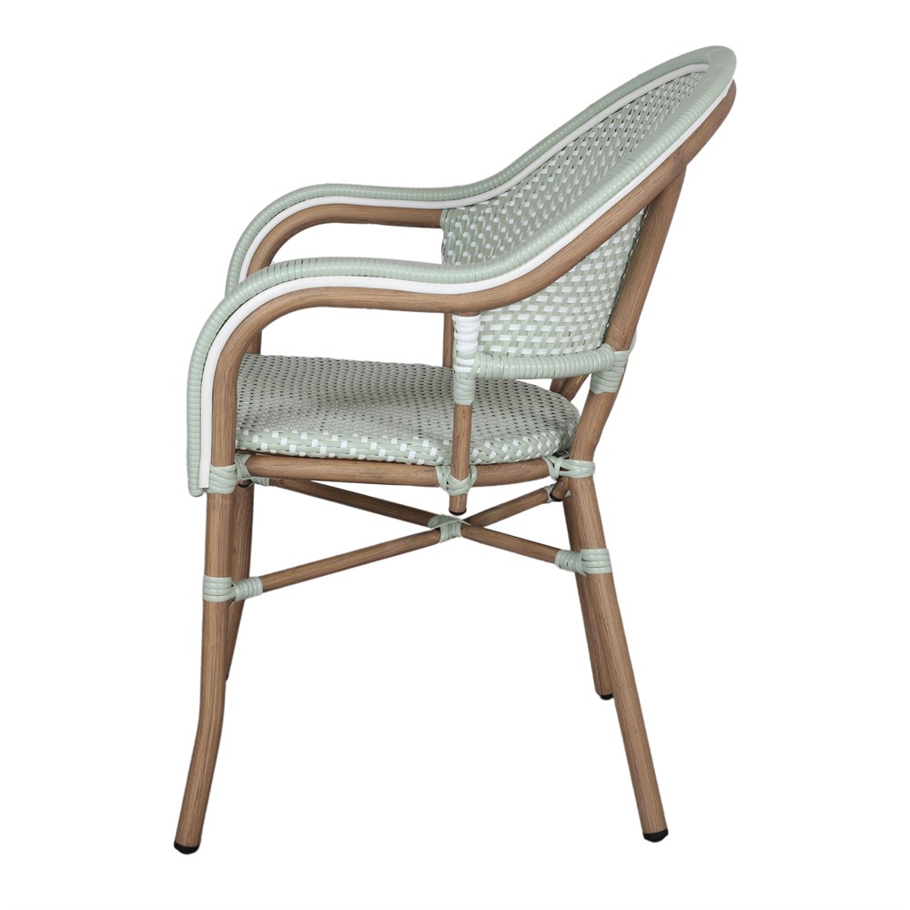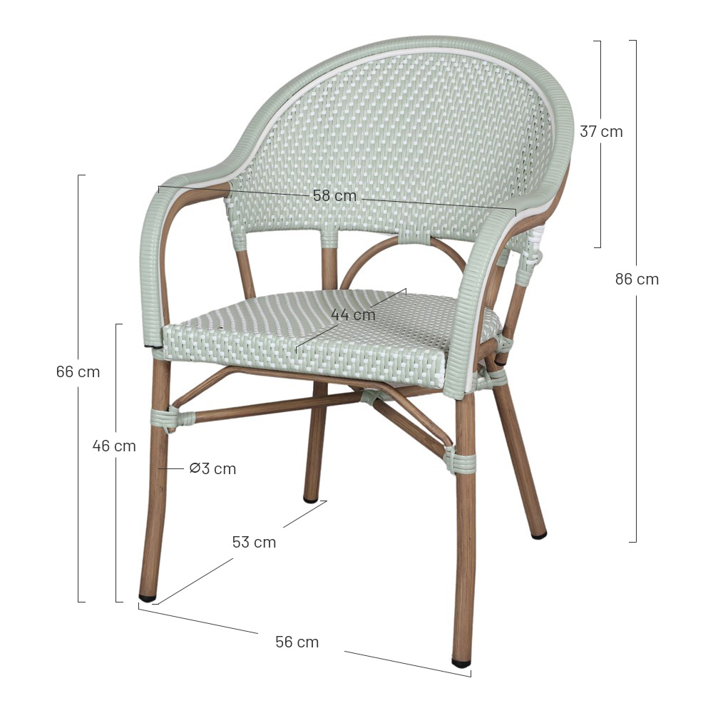 Notre chaise d’extérieur Noemi, de style Bistro, est fabriquée en aluminium avec une finition imitation bambou en fibre synthétique. Le rotin synthétique est sur le point de s’imposer sur nos terrasses, et ce n’est pas une surprise : son tissage solide donne de la texture au look et a été utilisé dans certains des designs les plus emblématiques de l’histoire de la décoration. Sur cette chaise d’extérieur, le rotin synthétique apporte une touche plus contemporaine que le rotin traditionnel et est facile d’entretien. Idéale pour un patio, une terrasse ou un jardin. Associez-la avec d’autres meubles de style bistrot pour une combinaison parfaite. Son design unique est la recette d’une pièce originale qui donnera à votre espace une touche parisienne.