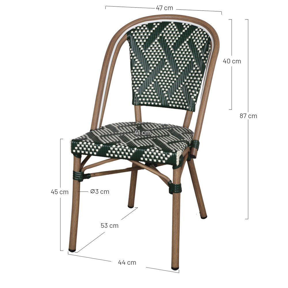 Notre chaise d’extérieur Today, de style Bistro, est fabriquée en aluminium avec une finition imitation rotin et fibre synthétique. Le rotin synthétique est sur le point de s’imposer sur toutes les terrasses, et ce n’est pas une surprise : son tissage solide donne de la texture au look et a été utilisé dans certains des designs les plus emblématiques de l’histoire de la décoration. Sur cette chaise d’extérieur, le rotin synthétique apporte une touche plus contemporaine que le rotin traditionnel et est facile d’entretien. Parfait pour un patio, une terrasse ou un jardin. Associez-la à d’autres meubles de style bistrot pour une combinaison parfaite. Son design unique est la recette d’une pièce originale qui donnera à votre espace une touche très parisienne.