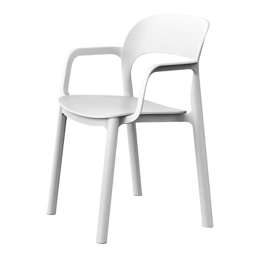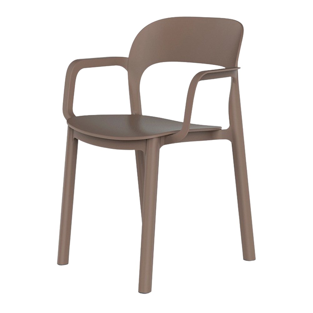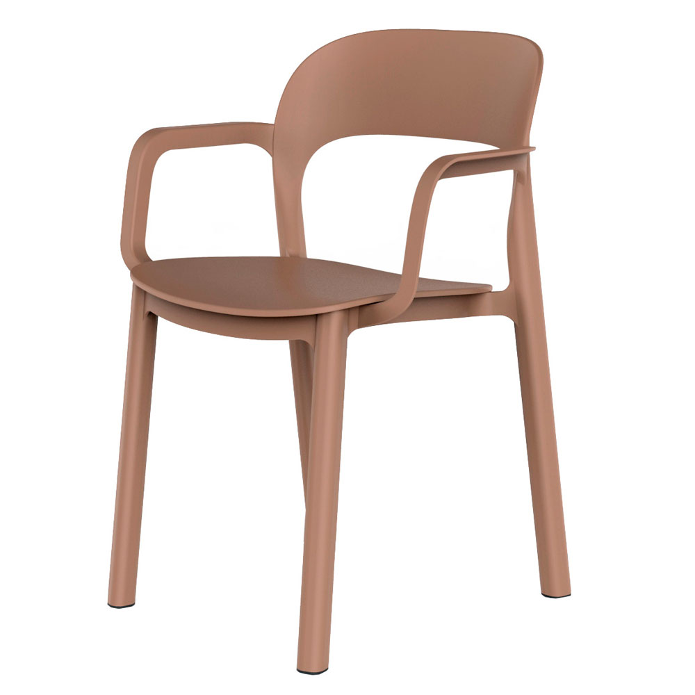 Chaise avec accoudoirs, pour usage intérieur ou extérieur. Structure et assise en polypropylène. Siège fixé à la structure par des vis en zinc. Empilable. Protection contre les UV.