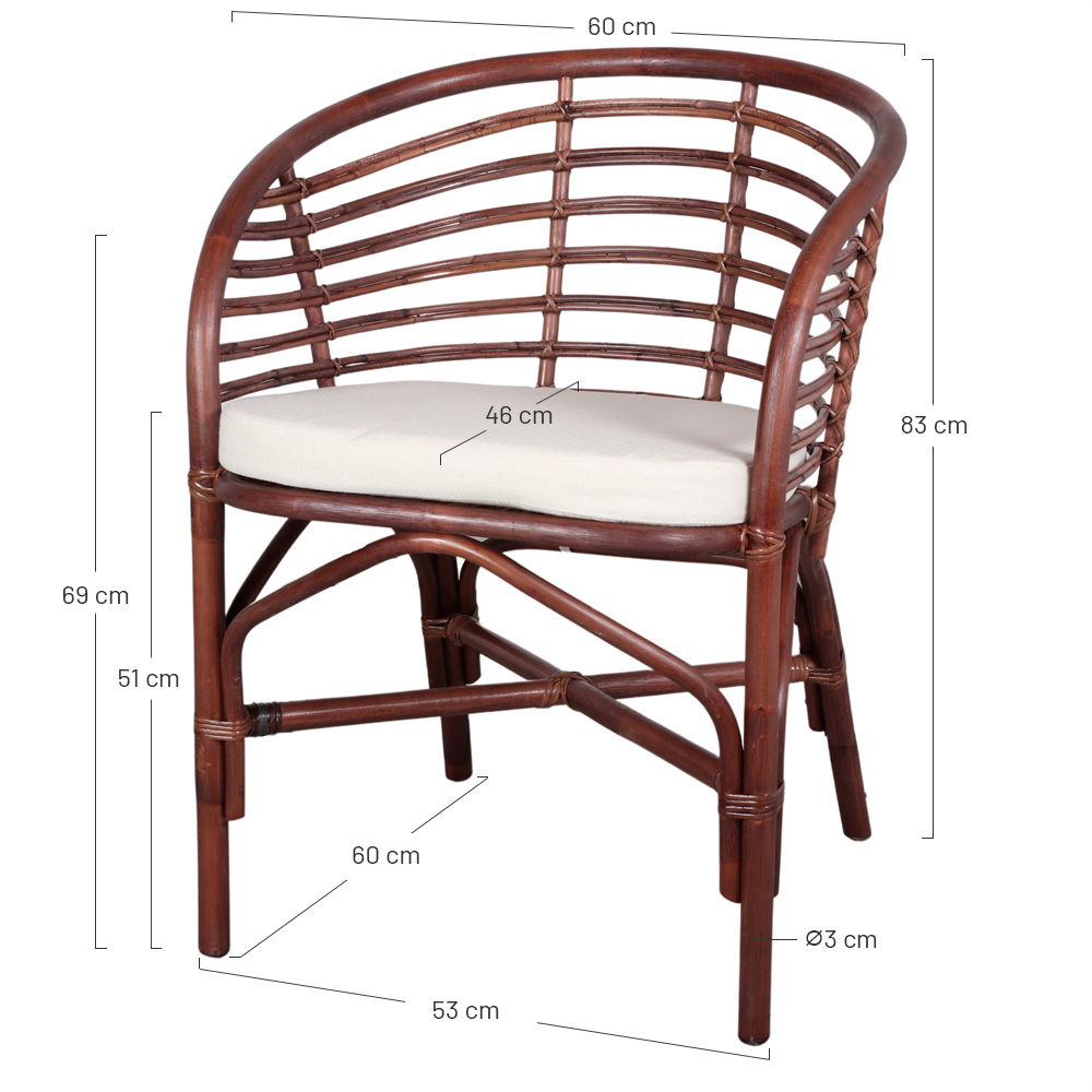 Dimensions : 60x60x83 cm | Hauteur d’assise : 51 | Accoudoirs : 69 à 79 cm | Épaisseur du coussin : 5 cm