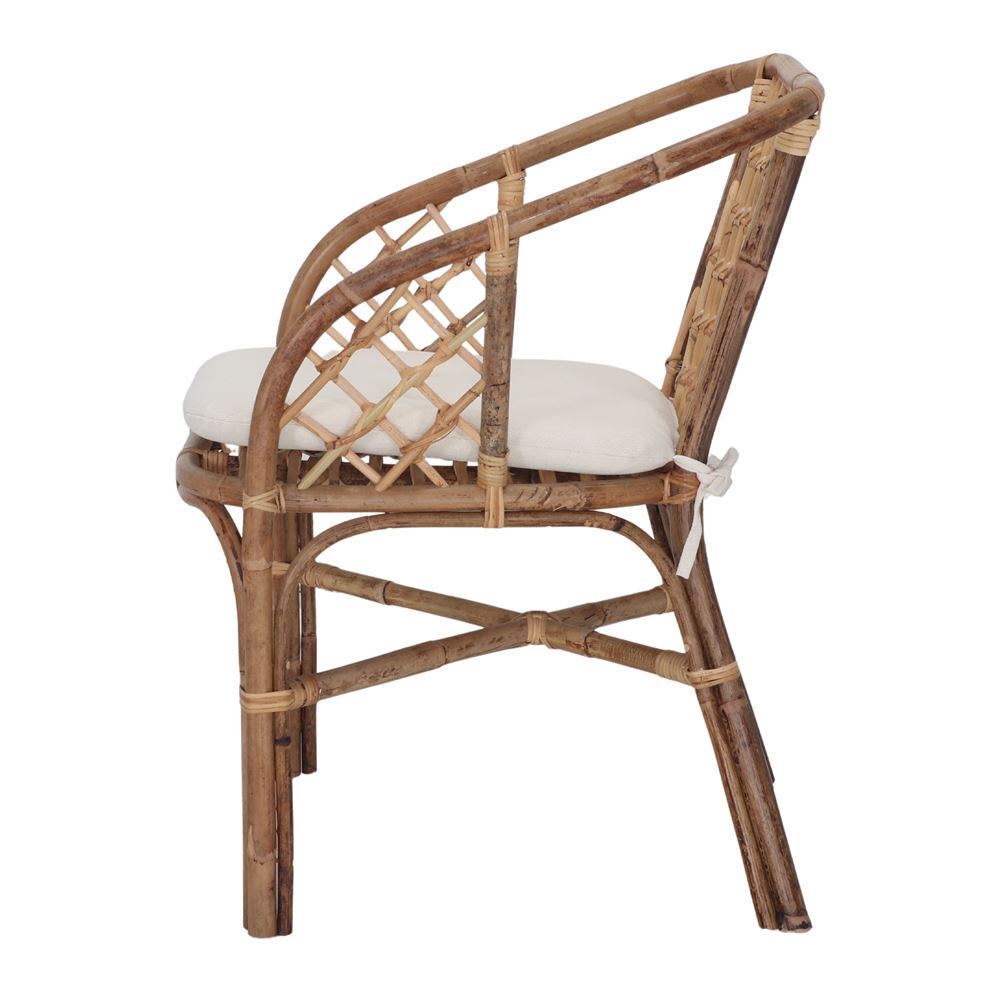 Chaise de style Bistrot fabriquée en rotin naturel et fibres naturelles. Coussin tapissé de toile blanche inclus.