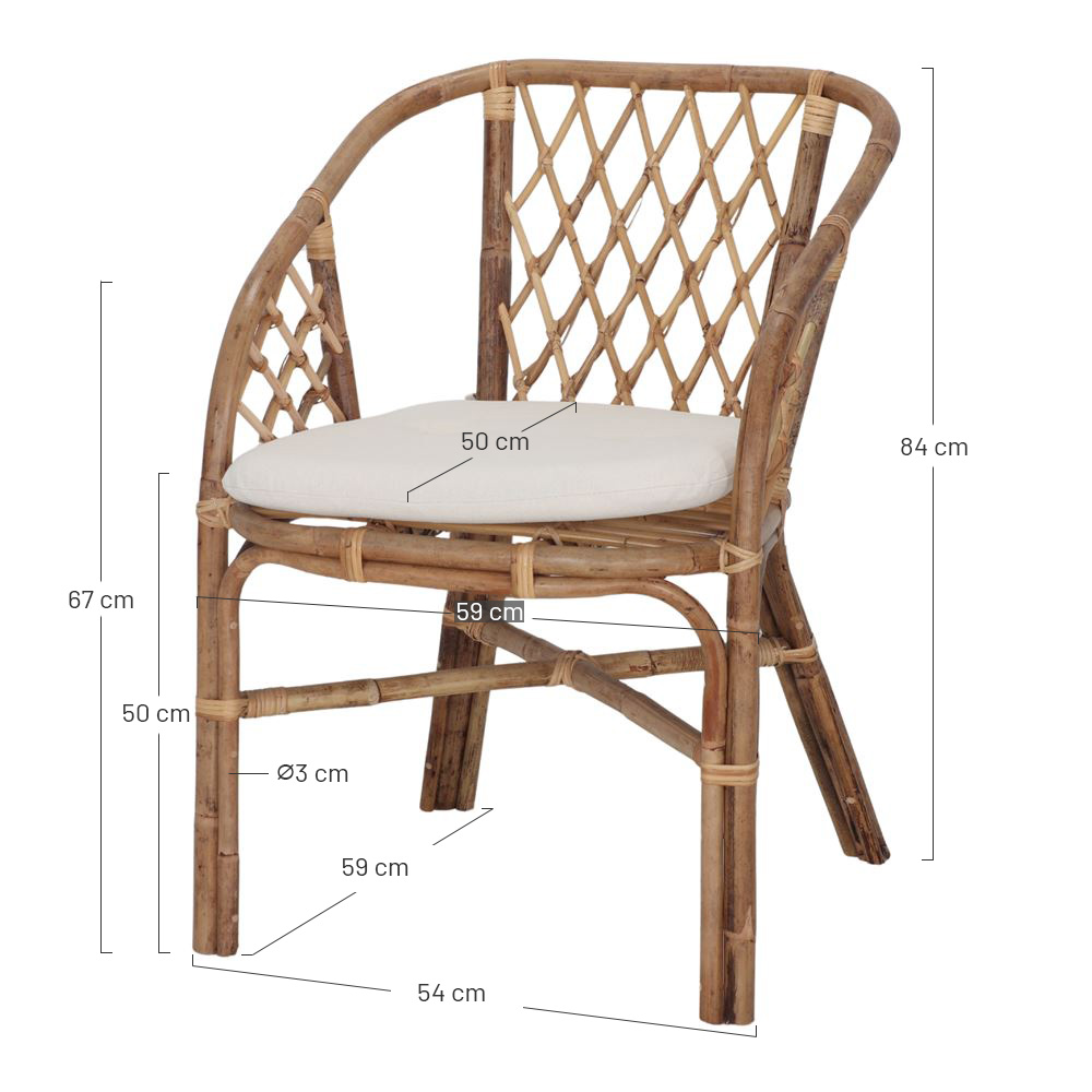 Dimensions: 59x67x84 cm | Hauteur d’assise: 50 cm (dont coussin de 4 cm d’épaisseur) | Accoudoirs : 67 à 79 cm