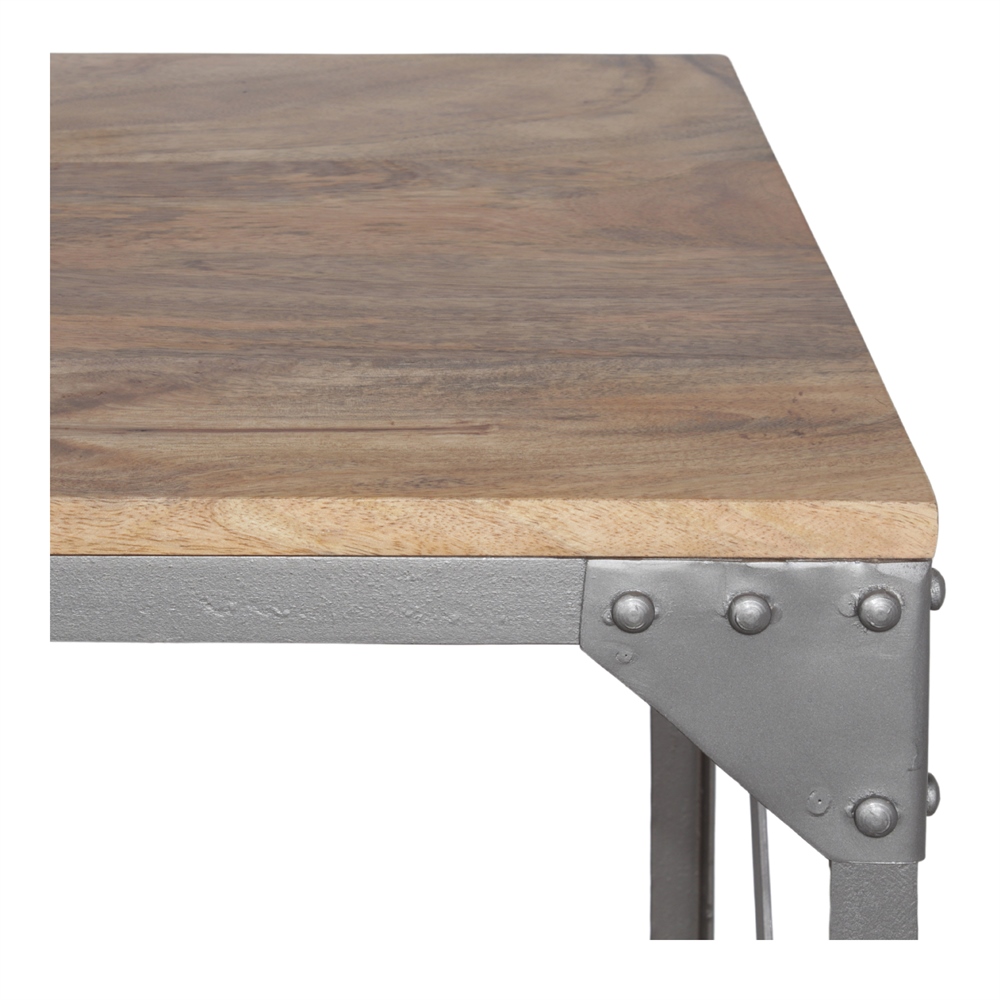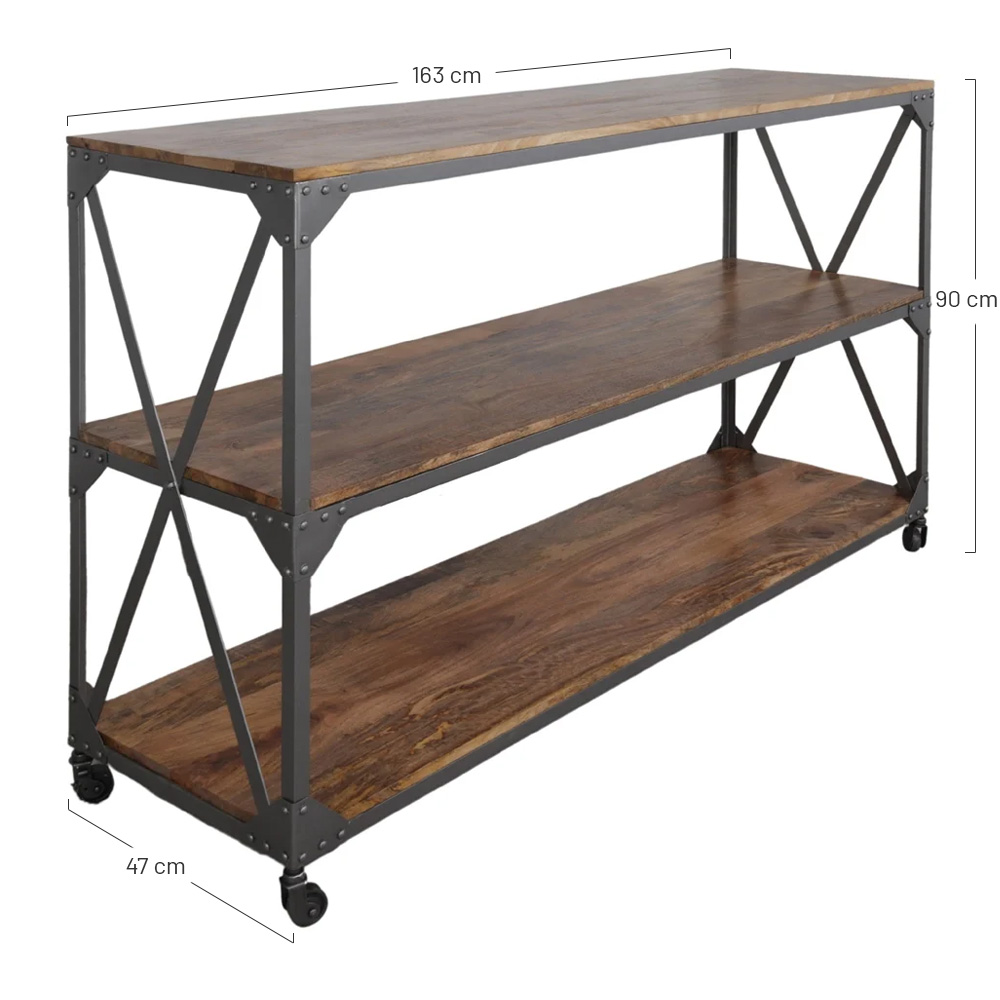 Chariot de rangement de style industriel. Structure en acier avec roues, finition effet usé, rayons en bois d’acacia.