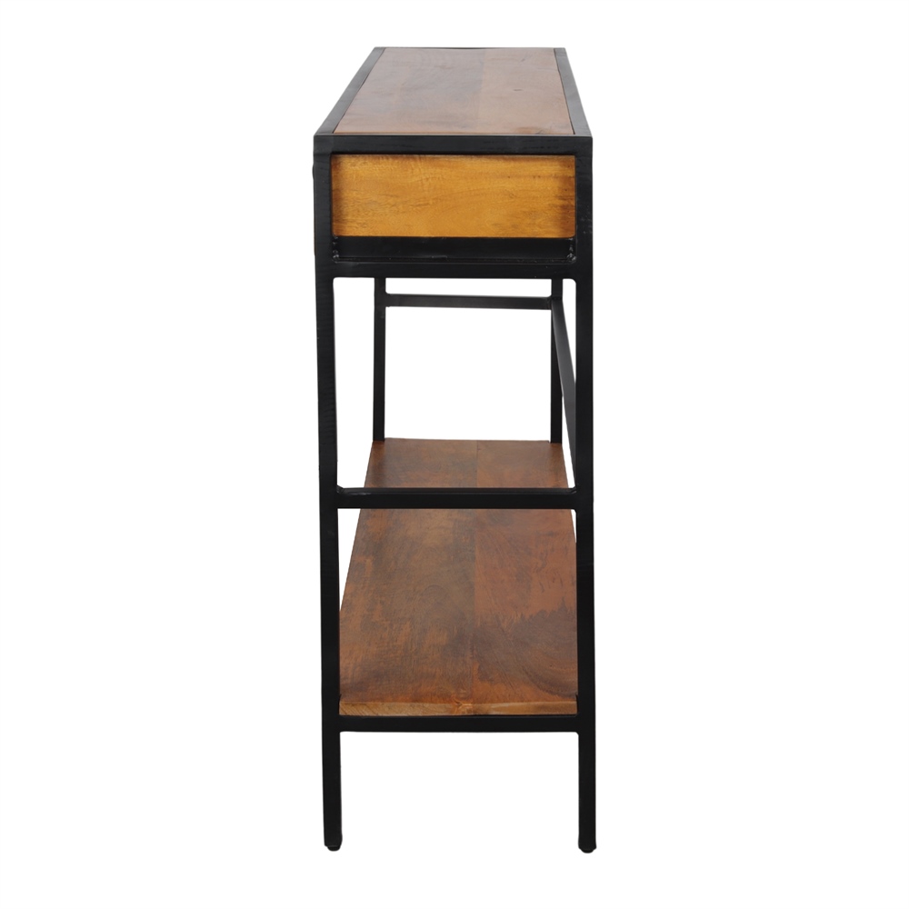 Difficile de le nier, notre console en bois et en métal Riben ne manque pas d’élégance ! On aime son piètement épuré et moderne en métal noir qui met en valeur l’ossature en bois massif. Une console qui peut être placée dans un salon d’inspiration industrielle ou dans un environnement plus contemporain. Profitez de son large plateau pour y exposer vos objets préférés : lampe, cadres, souvenirs de voyage…