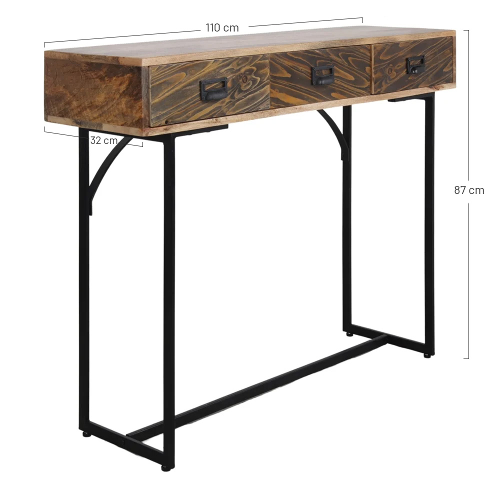 Difficile de le nier, notre console en bois et en métal de style industriel Stappy ne manque pas d’élégance ! On adore son piètement en métal noir épuré et moderne qui met en valeur sa structure en bois massif. Et sans compter sur la finition du meuble, tout en bois foncé qui laissera libre cours à votre imagination. Elle pourra être placée dans une pièce aux inspirations exotiques ou dans un environnement plus contemporain. Et côté fonctionnalité ? Dotée de tiroirs ouvrant sur de généreux espaces de rangement, cette console abritera joliment vos objets personnels, vos documents et pourquoi pas votre collection de films. Profitez de son plateau pour y exposer vos objets préférés : lampes, cadres, souvenirs de voyage…