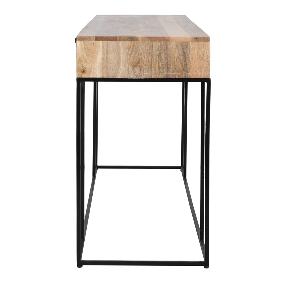 Difficile de le nier, notre console de style industriel ne manque pas de classe ! On aime son piétement épuré et moderne en métal noir mat qui met en avant la structure longiligne en bois massif. Et c’est sans compter sur la finition du meuble tout en bois foncé fumé qui laissera libre cours à votre imagination : l’inviter dans une pièce de vie à l’inspiration exotique ou dans une pièce plus contemporaine. Et côté fonctionnalité ? Équipée de portes donnant sur des espaces de rangement généreux, cette console gardera précieusement vos verres, documents et pourquoi pas votre collection de films. Profitez du long plateau pour y exposer vos objets fétiches : lampe, cadres, souvenirs de voyages…