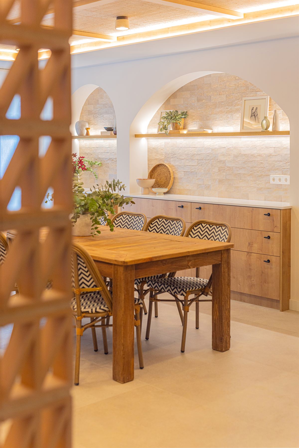 Le résultat est une maison conçue pour être appréciée : une grande cuisine ouverte se fond dans le salon principal, articulée autour d’un bar central qui rythme l’espace. Autour, les matériaux naturels et les tons chauds créent une atmosphère détendue, où le bois et le rotin apportent texture et caractère.