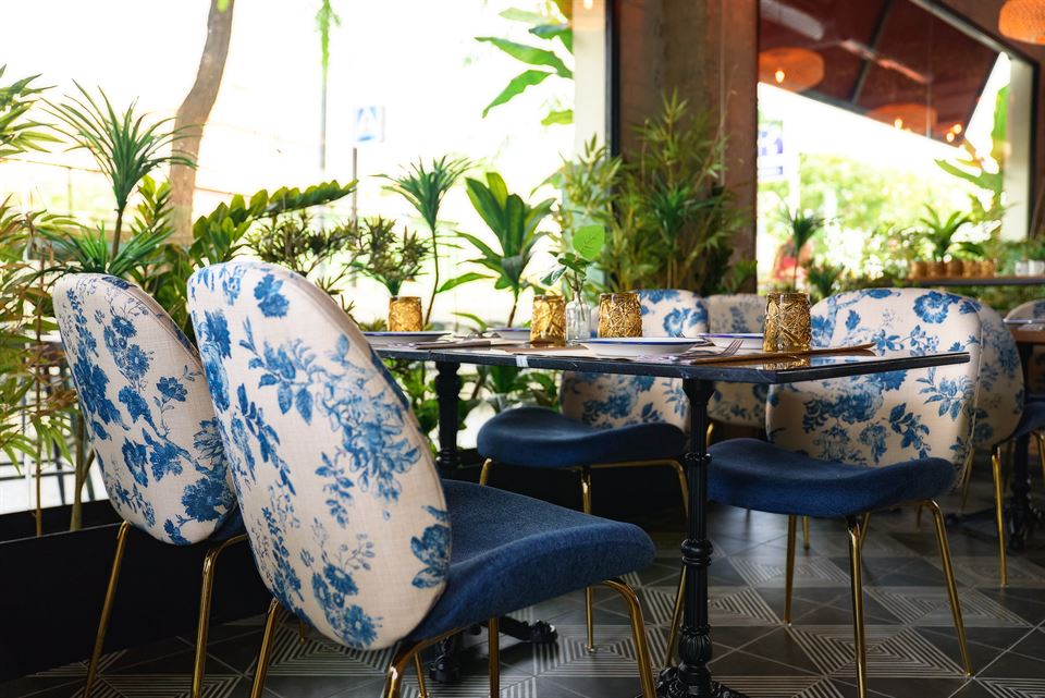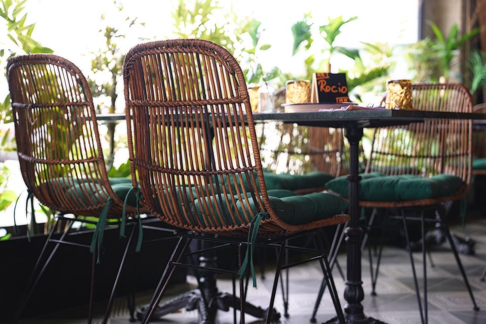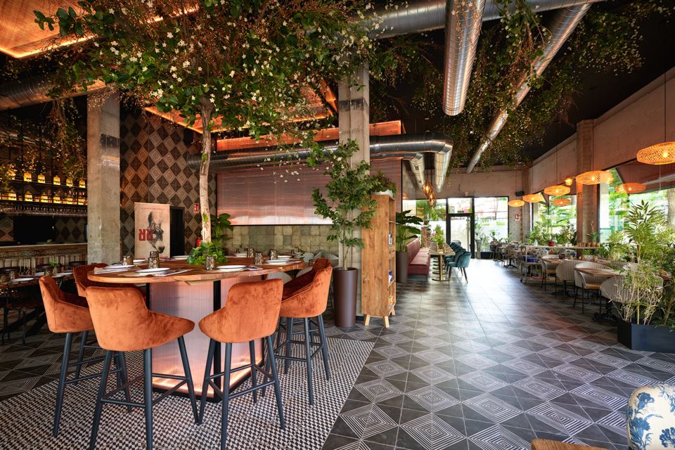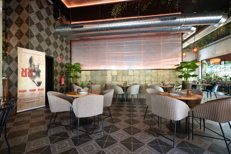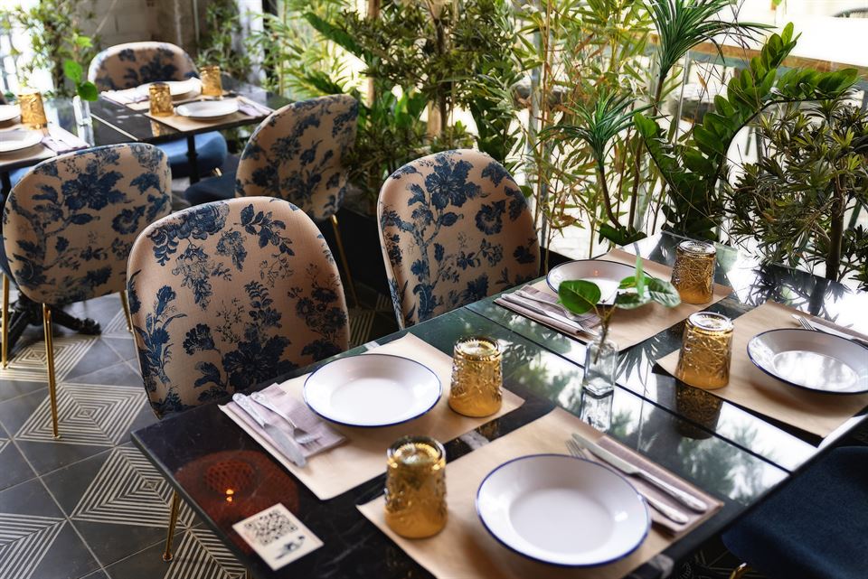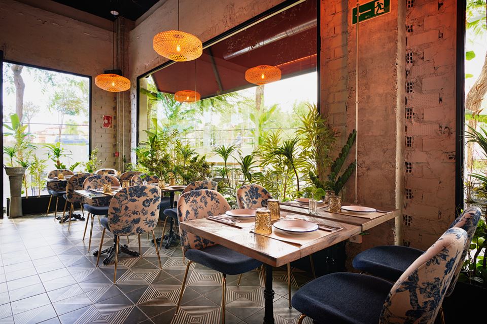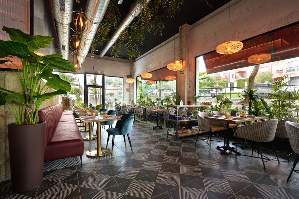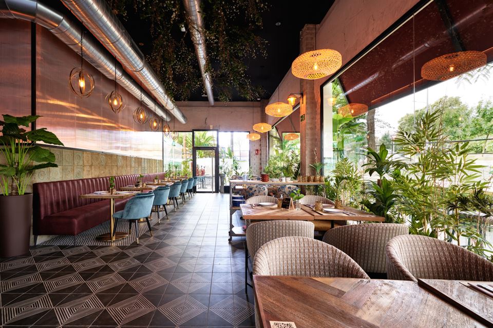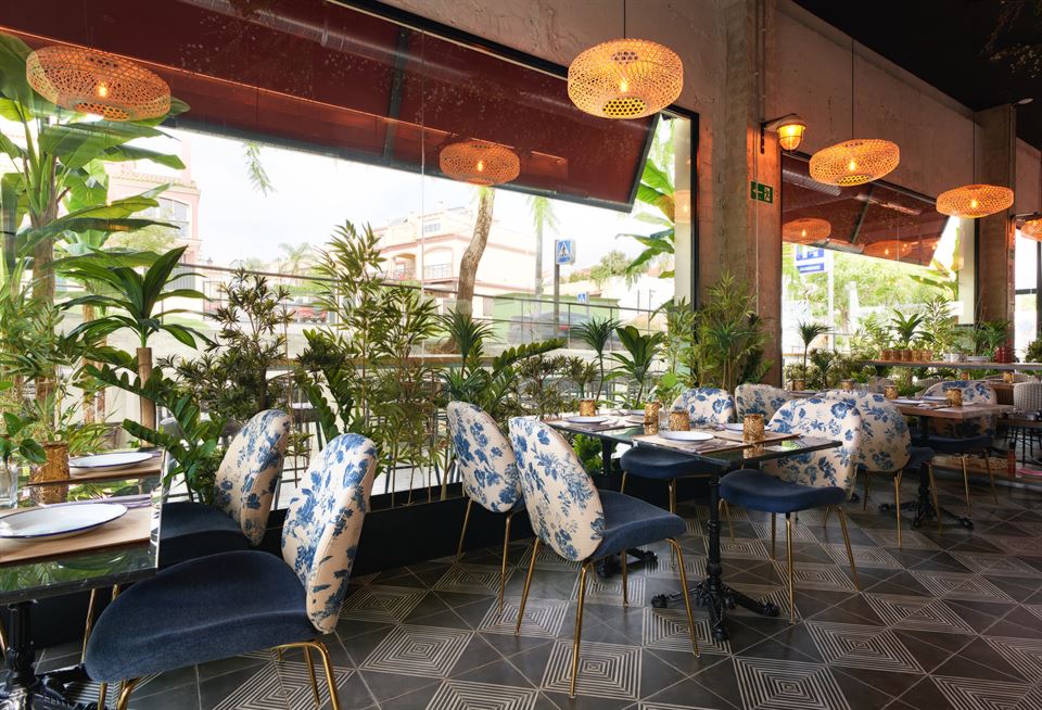 Jesús et son équipe ont été impliqués dans la conception des lieux, aidés par le studio d’architecture Cota 7. Comme toujours, en prenant soin du moindre détail, non seulement en cuisine, mais aussi dans la décoration du restaurant. Ils ont su créer un espace lumineux avec beaucoup de végétation. Les murs sont recouverts de tuiles vieillies, des lampes en métal sublimes et originales, des chaises tapissées d’imprimés floraux, des tabourets en cuir et en métal viennent renforcer la personnalité de ce bel endroit.