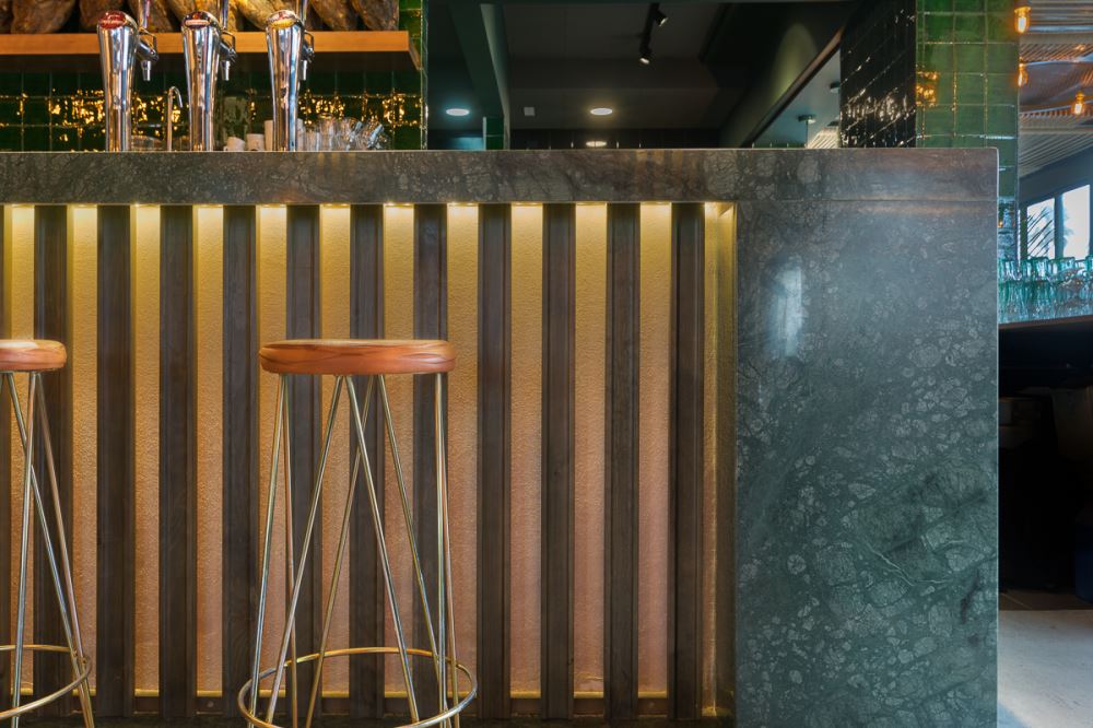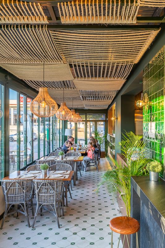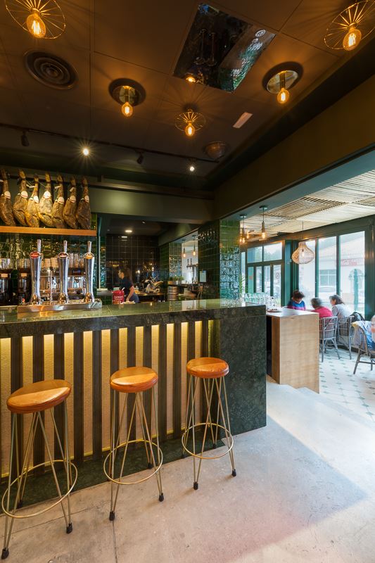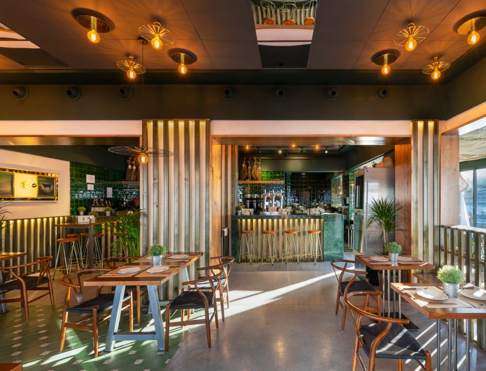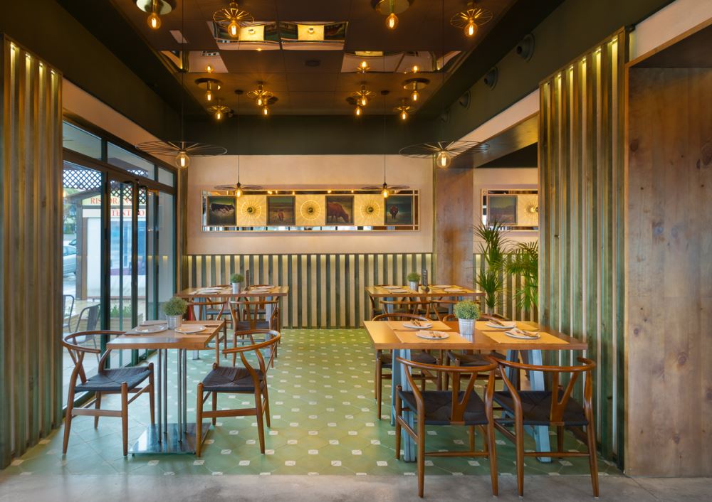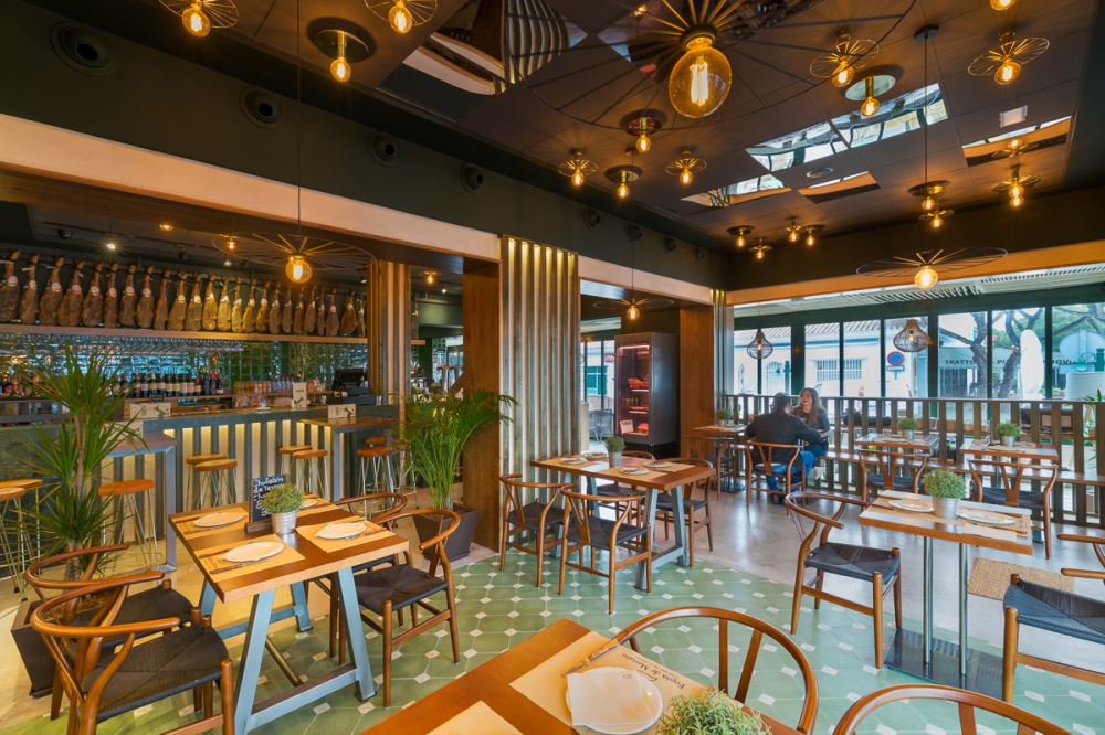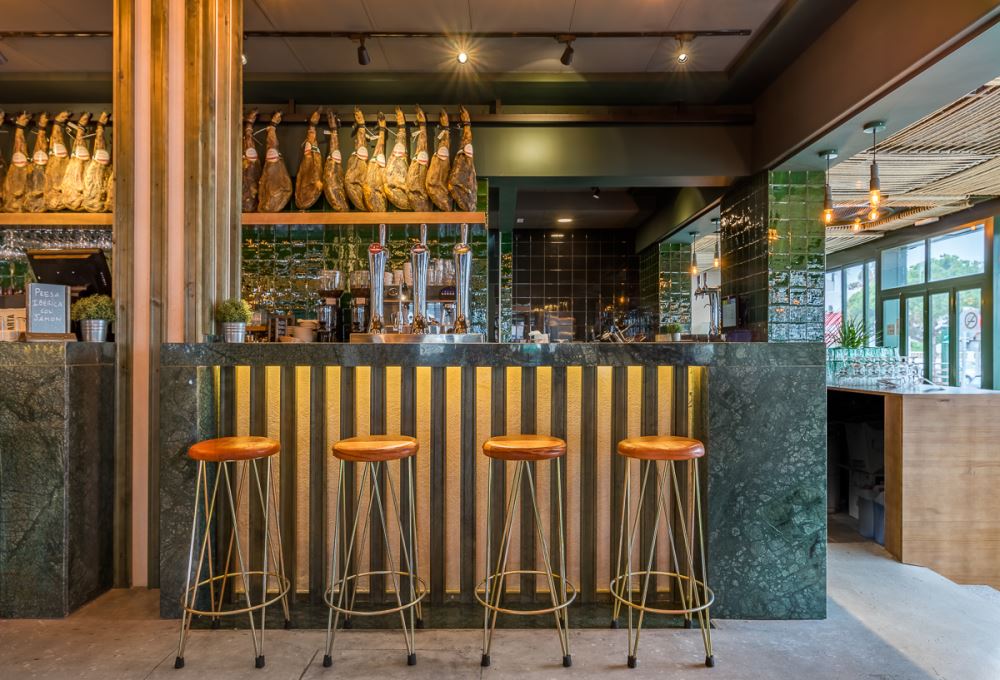 Du vert dominant, des carreaux de céramique émaillés à la main (les fameux “azujelos”, typiques de l’architecture andalouse), du bois et de la pierre naturelle définissent l’image de ce nouveau restaurant, lui conférant une uniformité et une identité unique.