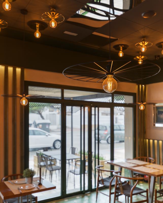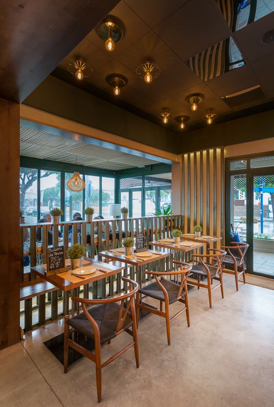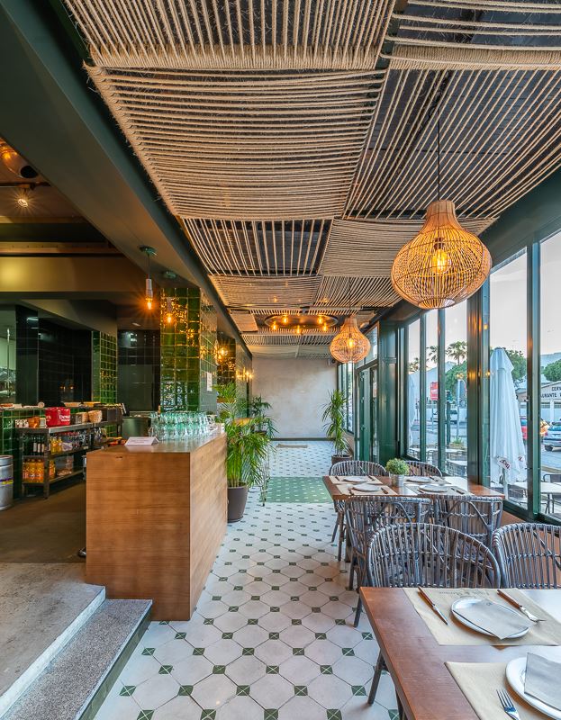 La salle de restaurant est bien délimitée avec son plancher en lattes de bois peintes en vert qui donne du relief au revêtement initial du sol, et facilite la séparation entre les différents espaces. L’autre côté de la pièce donne sur une terrasse semi-ouverte, reliée à l’entrée principale et à l’extérieur. Pour le plafond, ils ont opté pour de la corde de sisal.