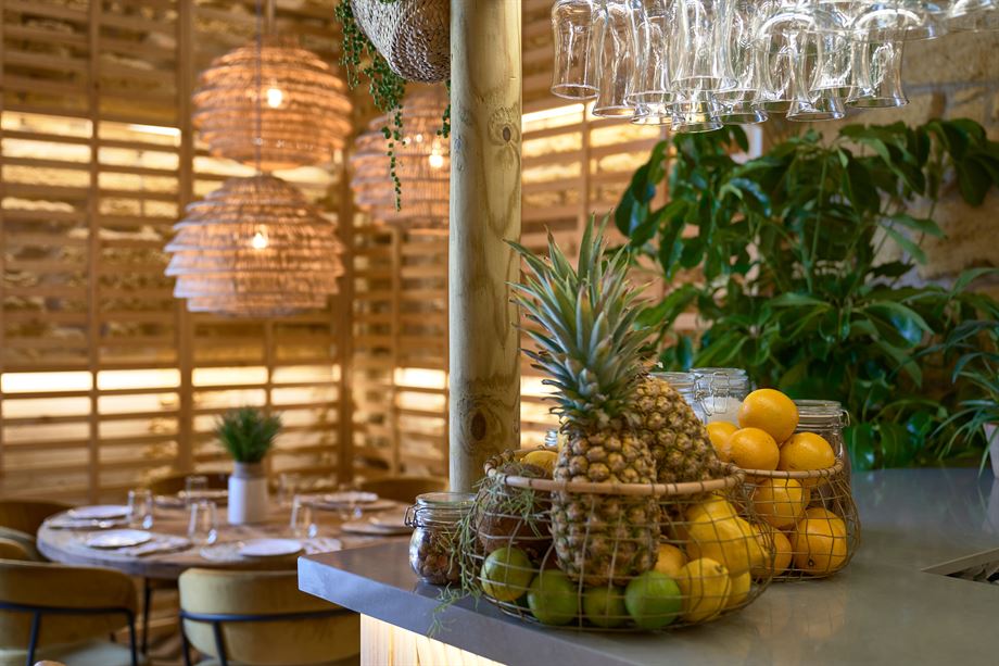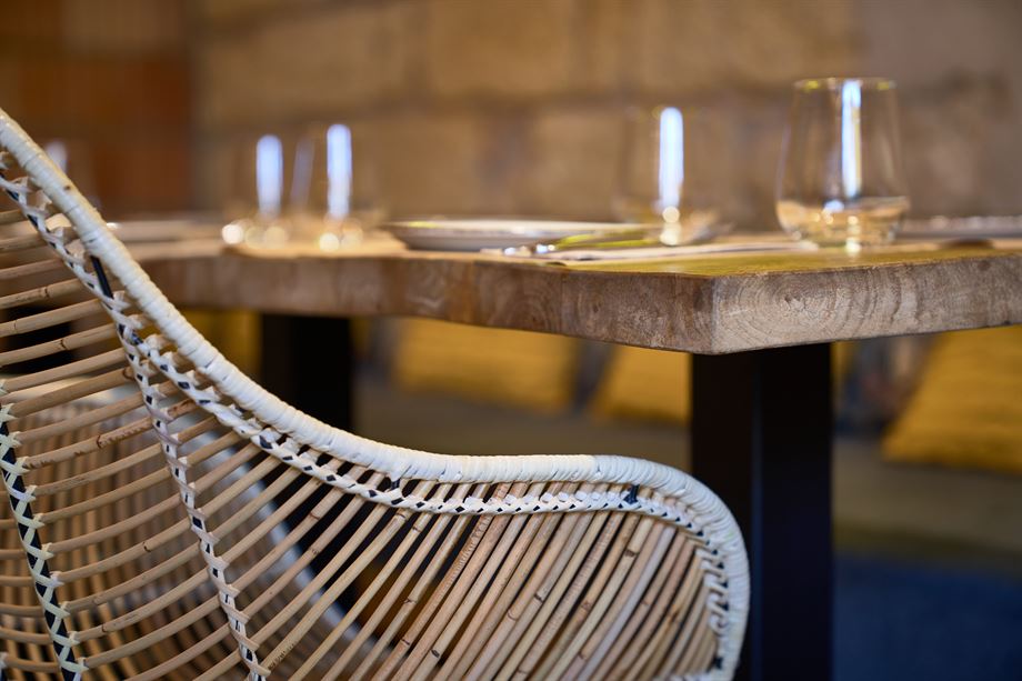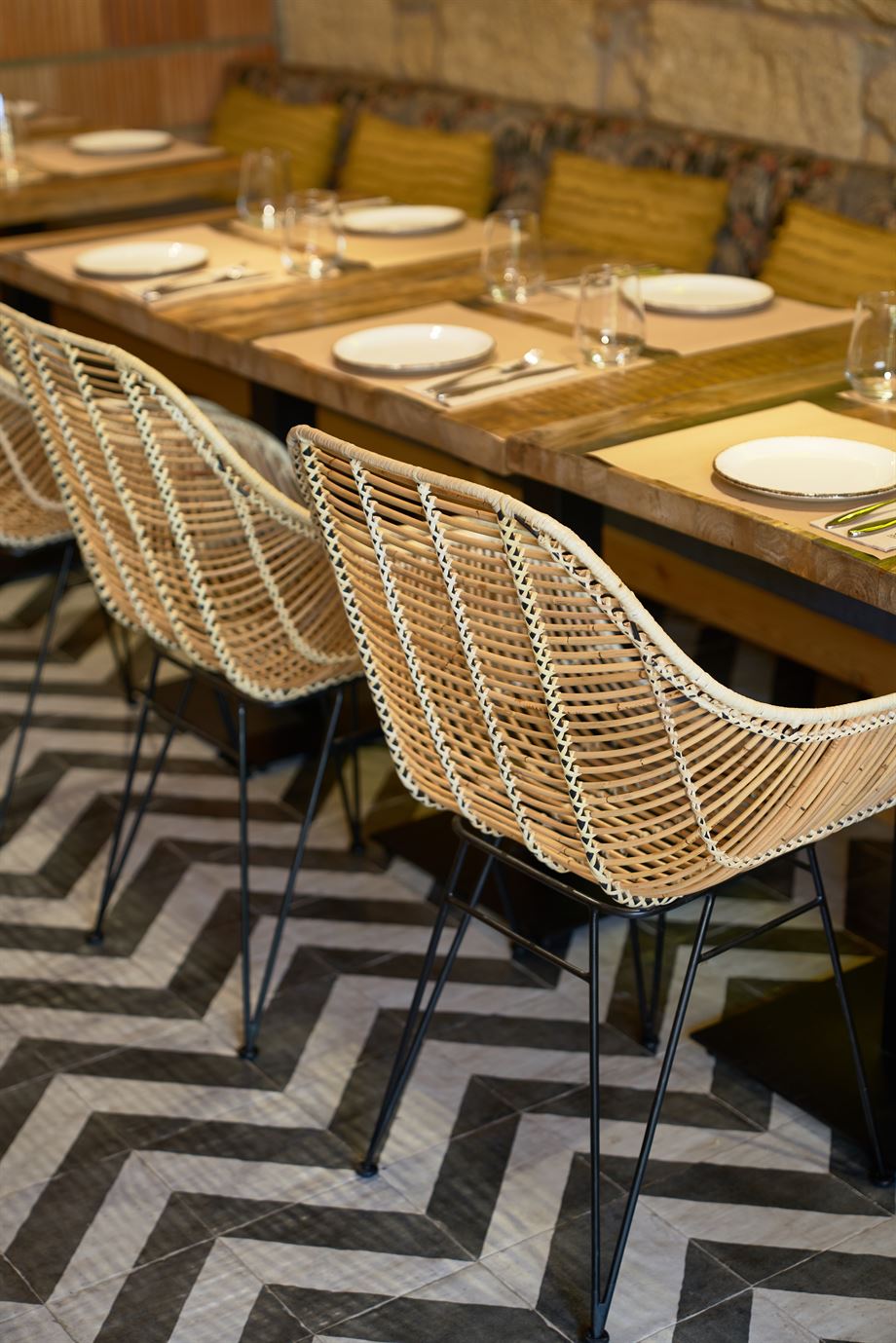 Les fibres comme le rotin pour les chaises et les lampes, et l’utilisation de revêtements tapissés dans les tons curry. Pour contrebalancer le tout, des plantes naturelles ont été intégrées pour apporter de la fraicheur à l’établissement.