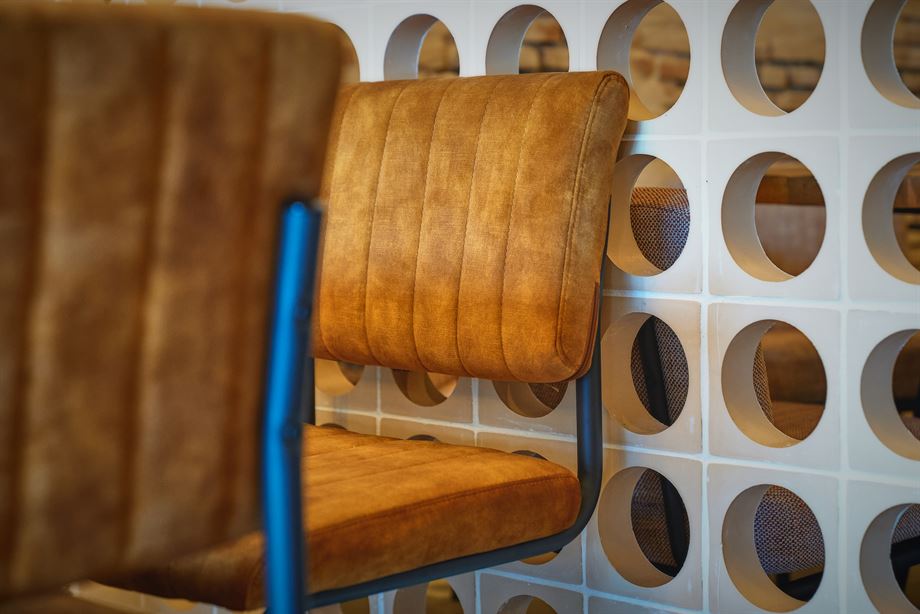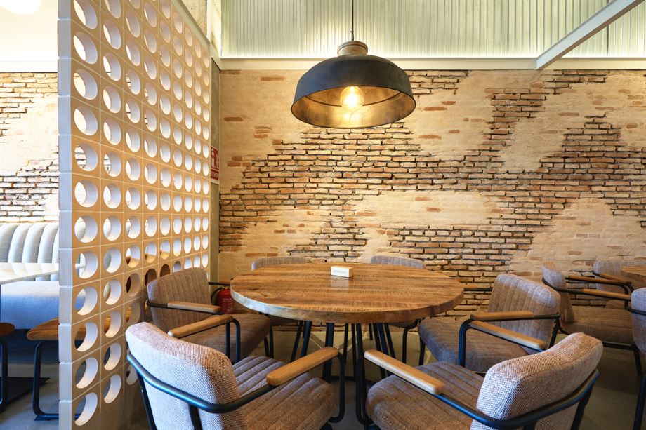 Enfin, et pour finir, le dernier espace dispose de grandes tables rondes avec plateaux en bois, des chaises tapissées avec finitions en bois et structure en métal, avec de belles lampes en métal vieilli qui donnent la touche finale à la décoration de l’établissement.