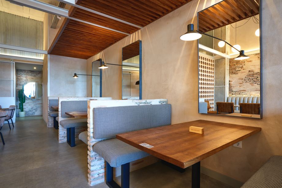 À l’entrée du restaurant, nous trouvons la terrasse, avec des meubles d’imitation bois et une grande enseigne en tôle rouillée qui nous indique le nom de l’établissement, c’est la première rencontre avec le style du lieu, un style industriel très sobre et traditionnel, qui ne laisse pas indifférent. L’équipe de design d’intérieur de MisterWils, comme toujours, a pris soin de tous les détails pour faire en sorte que MAMAINA se distingue de sa concurrence.