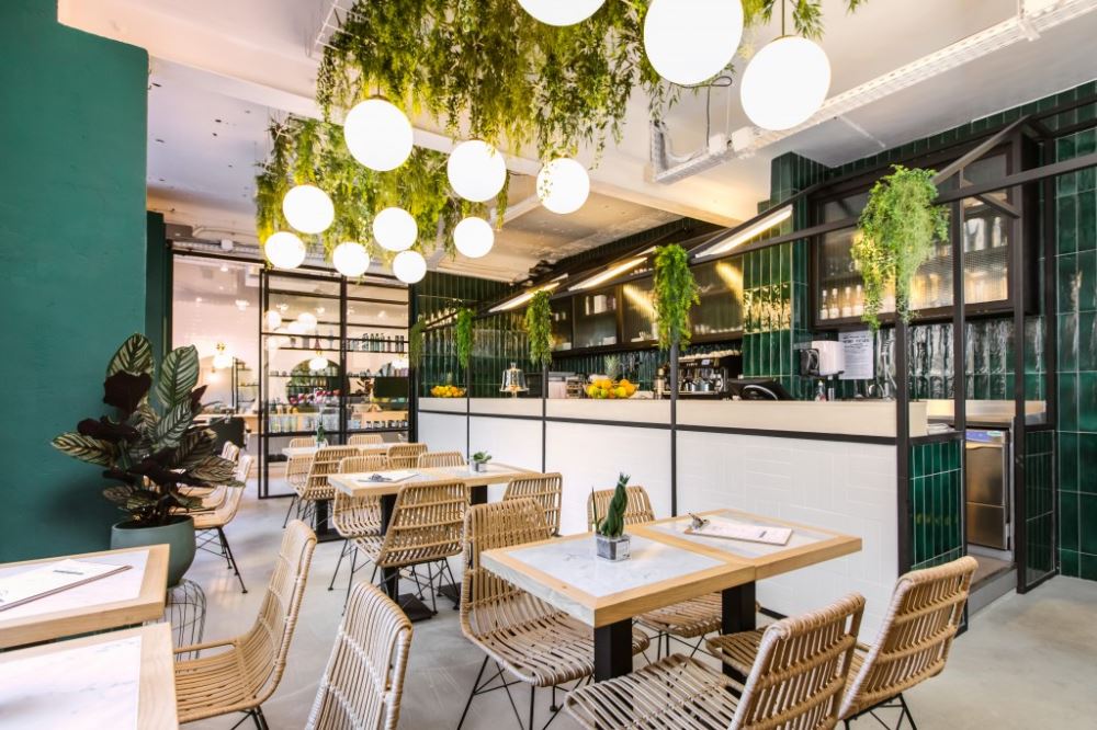 Le projet a été développé par l’architecte d’intérieur français Steve Baldini. Dans le catalogue MisterWils, il a choisi les produits suivants : les chaises Gino couleur naturelle, les tables Davox couvertes de marbre et de bois de châtaigne, et un spectaculaire plafond fait de végétation et de lampes Gran Café.