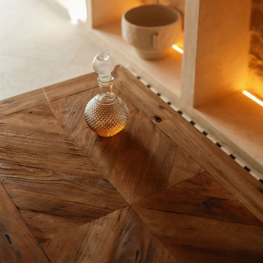 Table basse Terence, fabriquée en bois de pin recyclé.