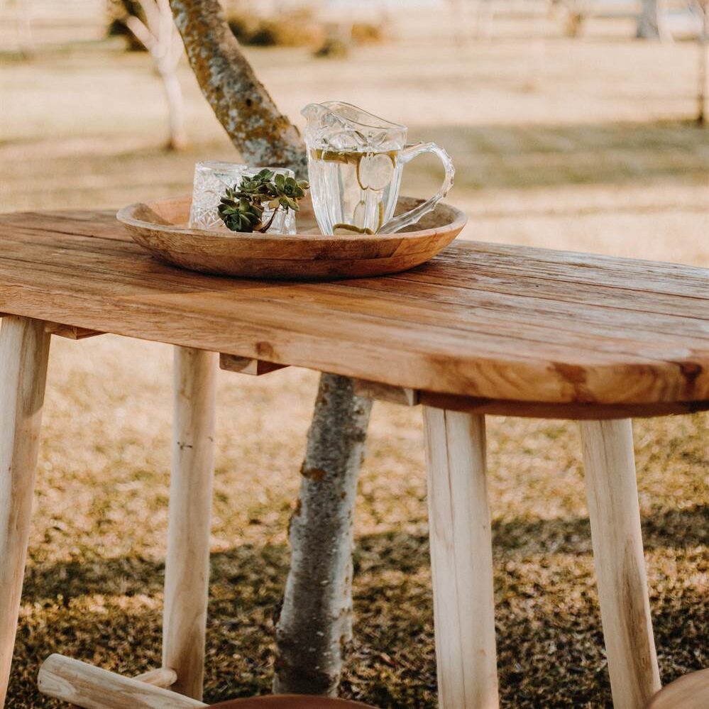 Table de salle à manger ovale de style rustique fabriquée en bois de teck. Structure et plateau en bois.