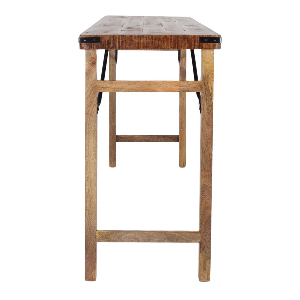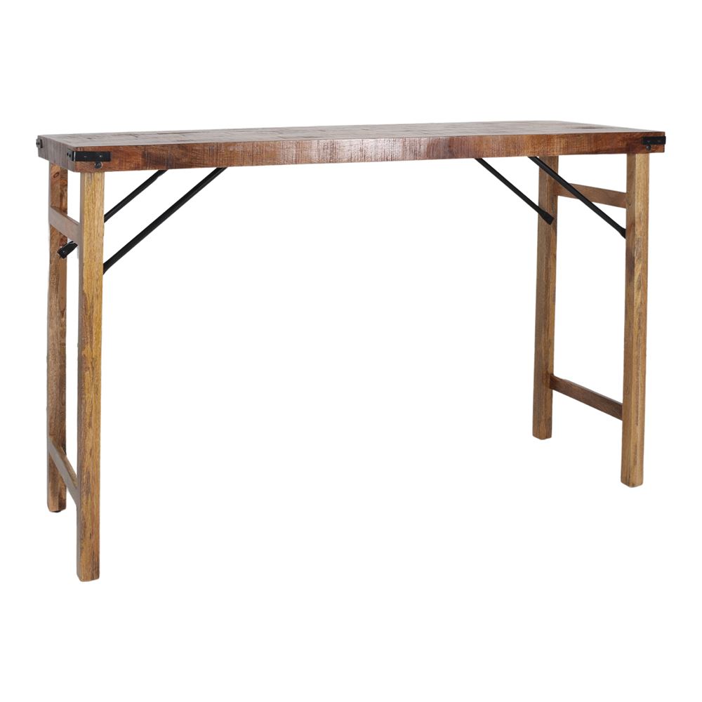 Table haute pliante Bosco, style industriel. Une table polyvalente, en bois tropical, qui a aussi la particularité d’être pliable : vous pouvez replier ses pieds et la transporter facilement.