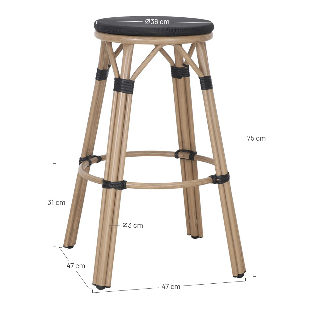 La structure est réalisée en aluminium tubulaire avec une finition raffinée avec effet bambou, qui lui confère non seulement un aspect naturel et sophistiqué, mais garantit également légèreté et résistance aux intempéries. Grâce à ce matériau, le tabouret est durable, stable et facile à déplacer, idéal pour les terrasses, patios et jardins.