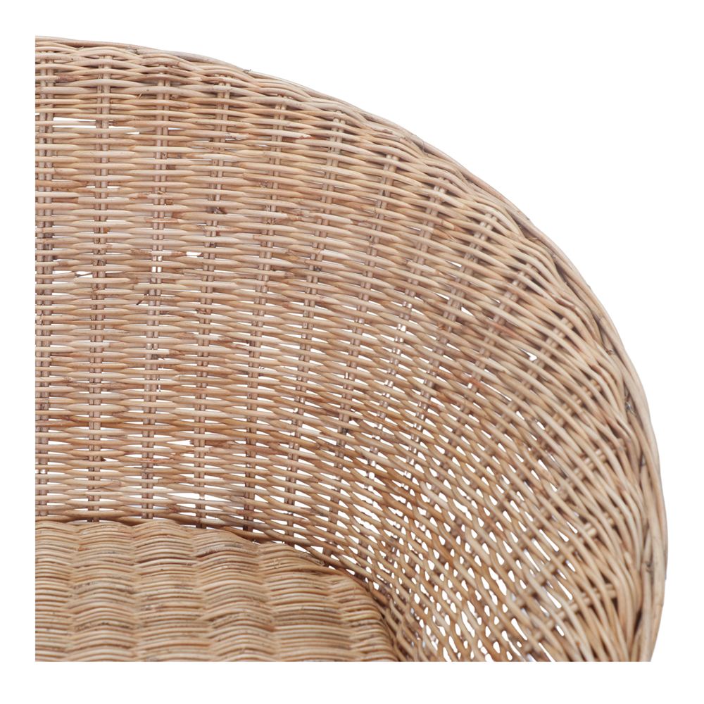 La structure est fabriquée en bois de teck massif, un bois noble qui se distingue par sa résistance et sa durabilité. Sa finition naturelle met en valeur les veines du bois et apporte de la chaleur à l’ensemble, garantissant stabilité et solidité même en cas d’utilisation continue. Cette base solide est complétée par l’assise et le dossier en fibre synthétique tressée, un matériau léger et résistant qui offre confort, respirabilité et un aspect artisanal.