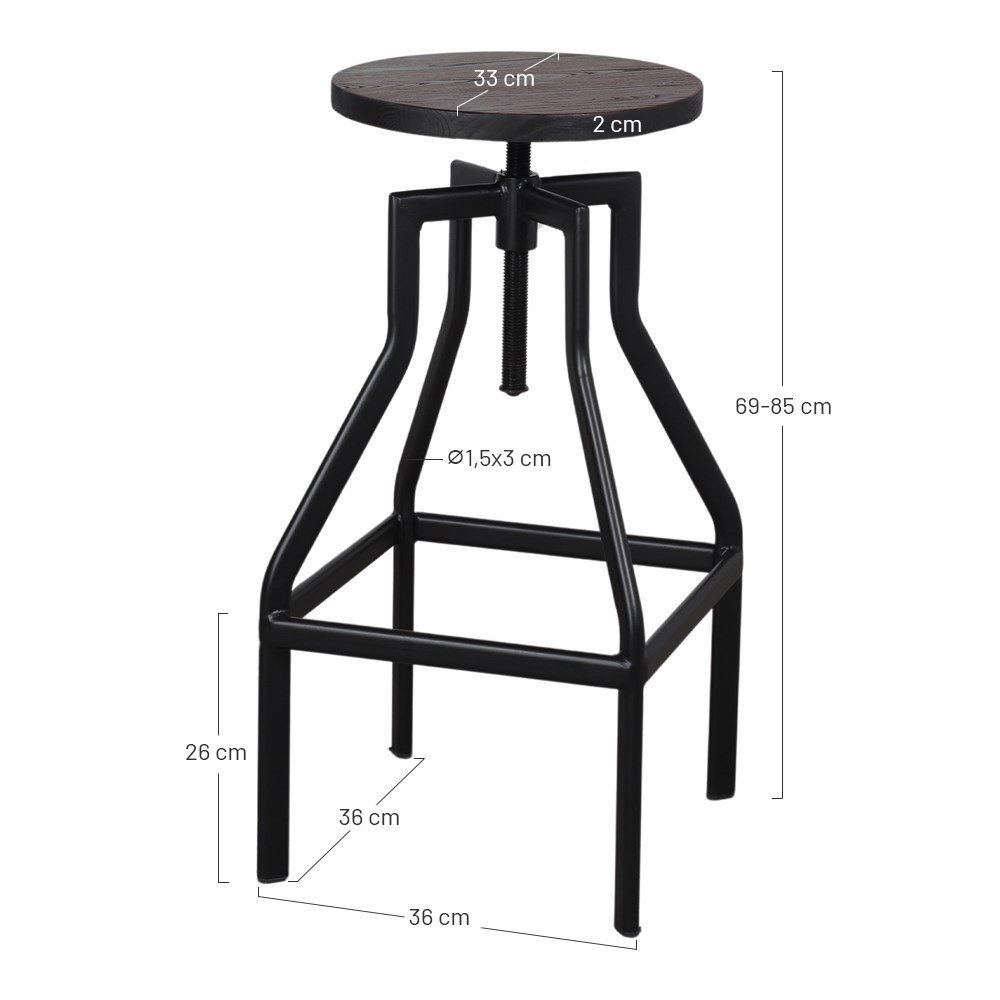 Base : 36 x 36 cm | Hauteur minimale : 69 cm | Hauteur maximale : 85 cm | Assise : Ø 33 cm